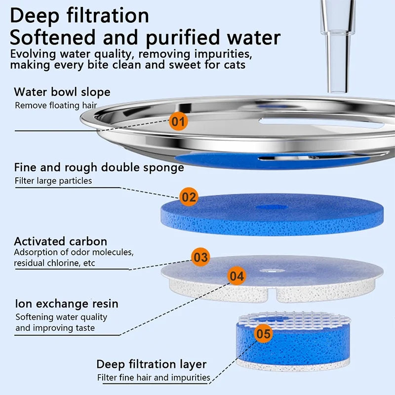💧 Naturalny, ciągły przepływ wody – ruch wody przyciąga uwagę kota i zachęca do częstszego picia, zapobiegając odwodnieniu i chorobom układu moczowego.